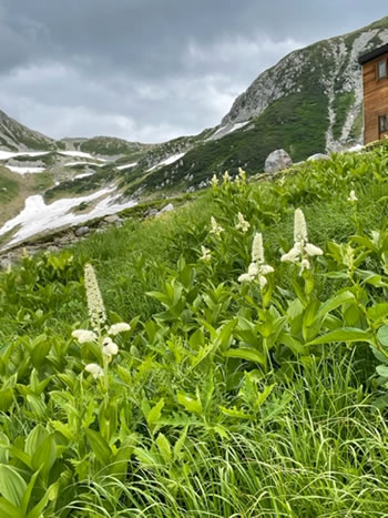 その日ホテル主催の弥陀ヶ原散策ツアーは、あいにくの雷雨で中止となりましたが、 翌早朝、二人で散策を満喫しました(写真)。